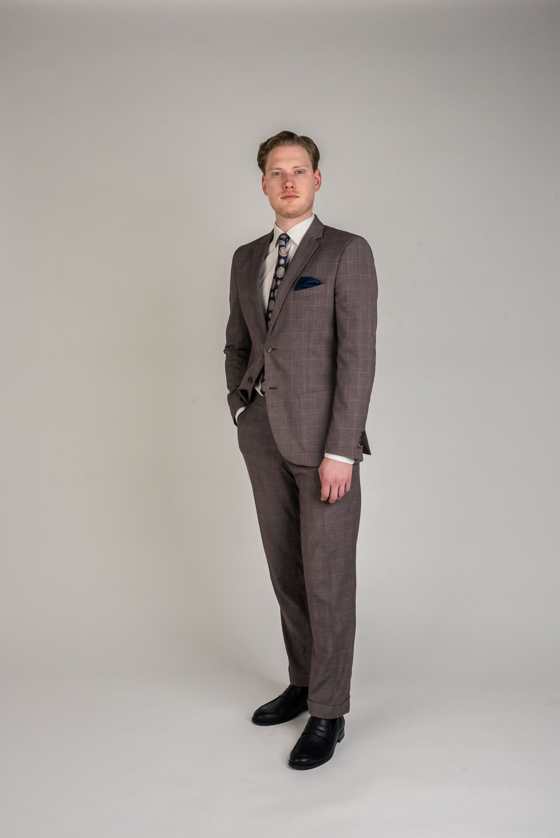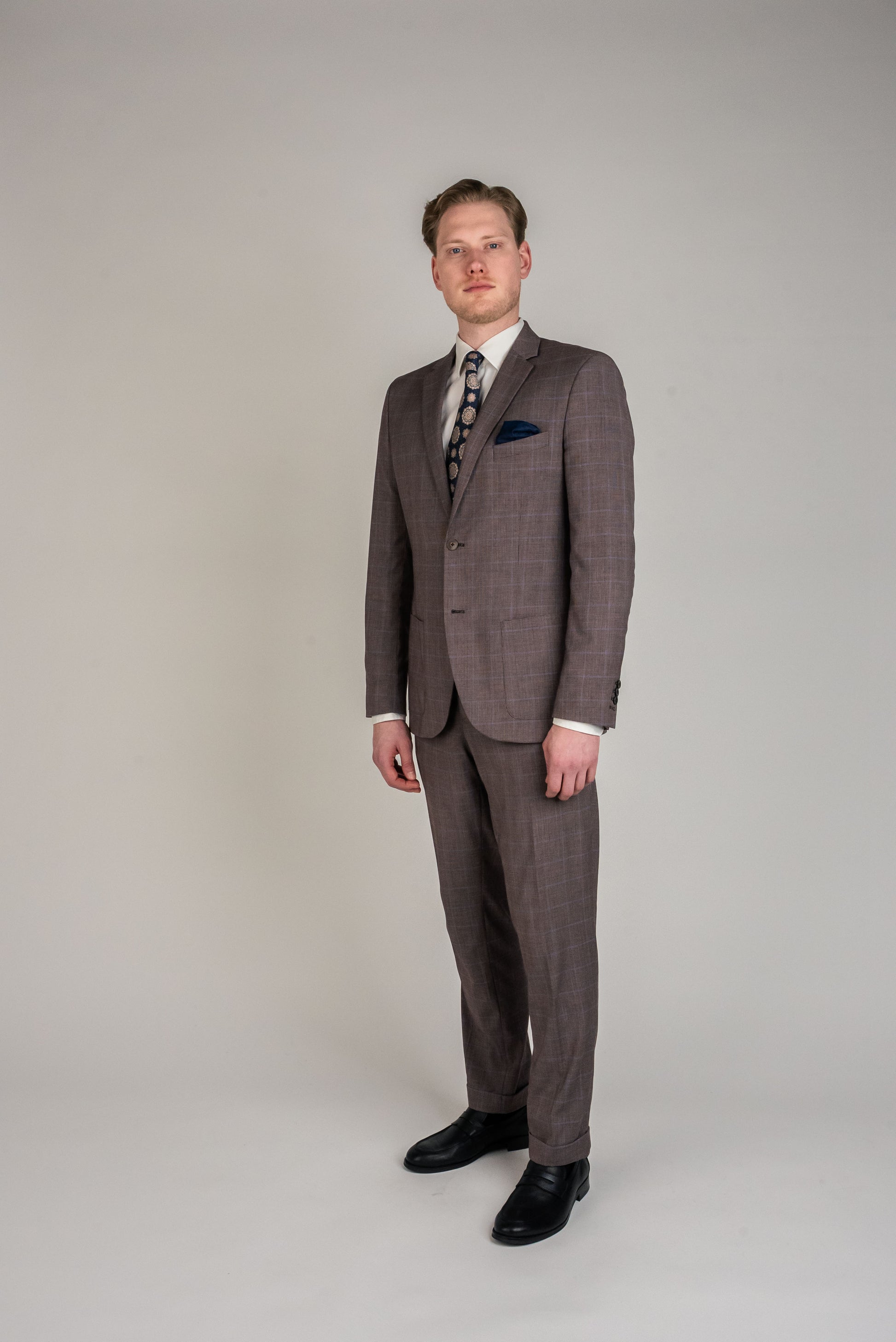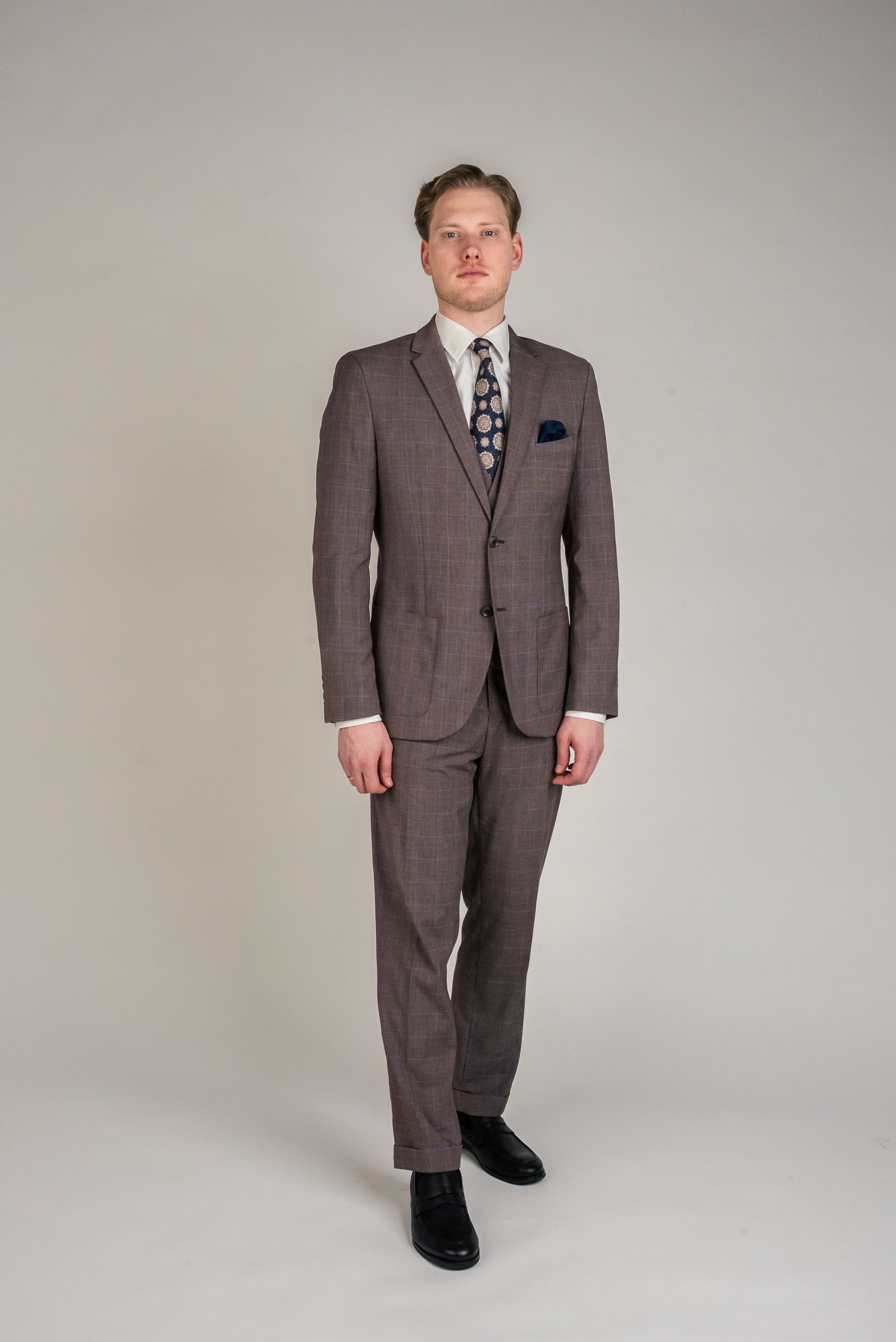 Pas Zambezi er et stilfuldt jakkesæt i en varm brun nuance med et elegant ternet mønster. Det er skabt til manden, der ønsker at kombinere traditionel skrædderkunst med et moderne og raffineret udtryk. Den dybe brune farve giver jakkesættet karakter, mens ternene tilfører et diskret, men markant visuelt element.