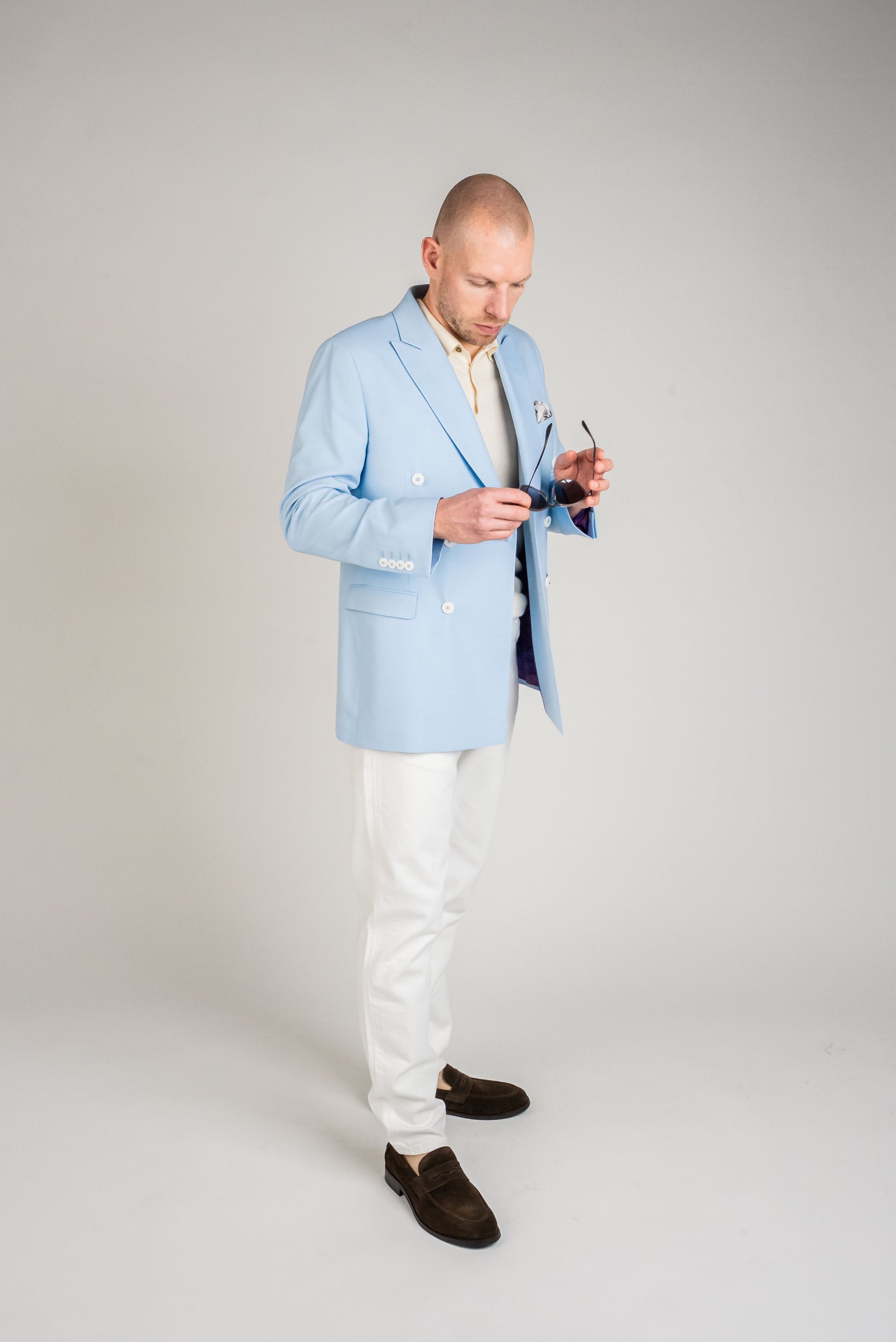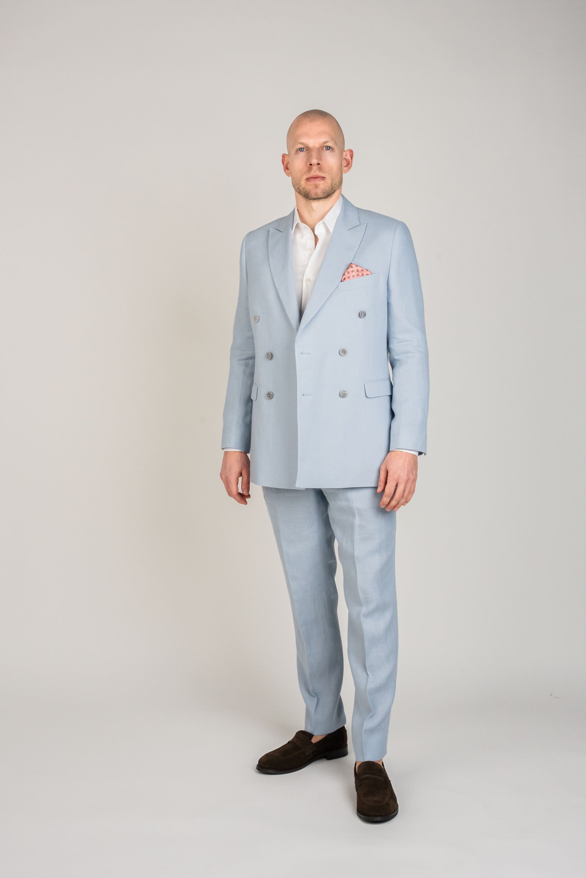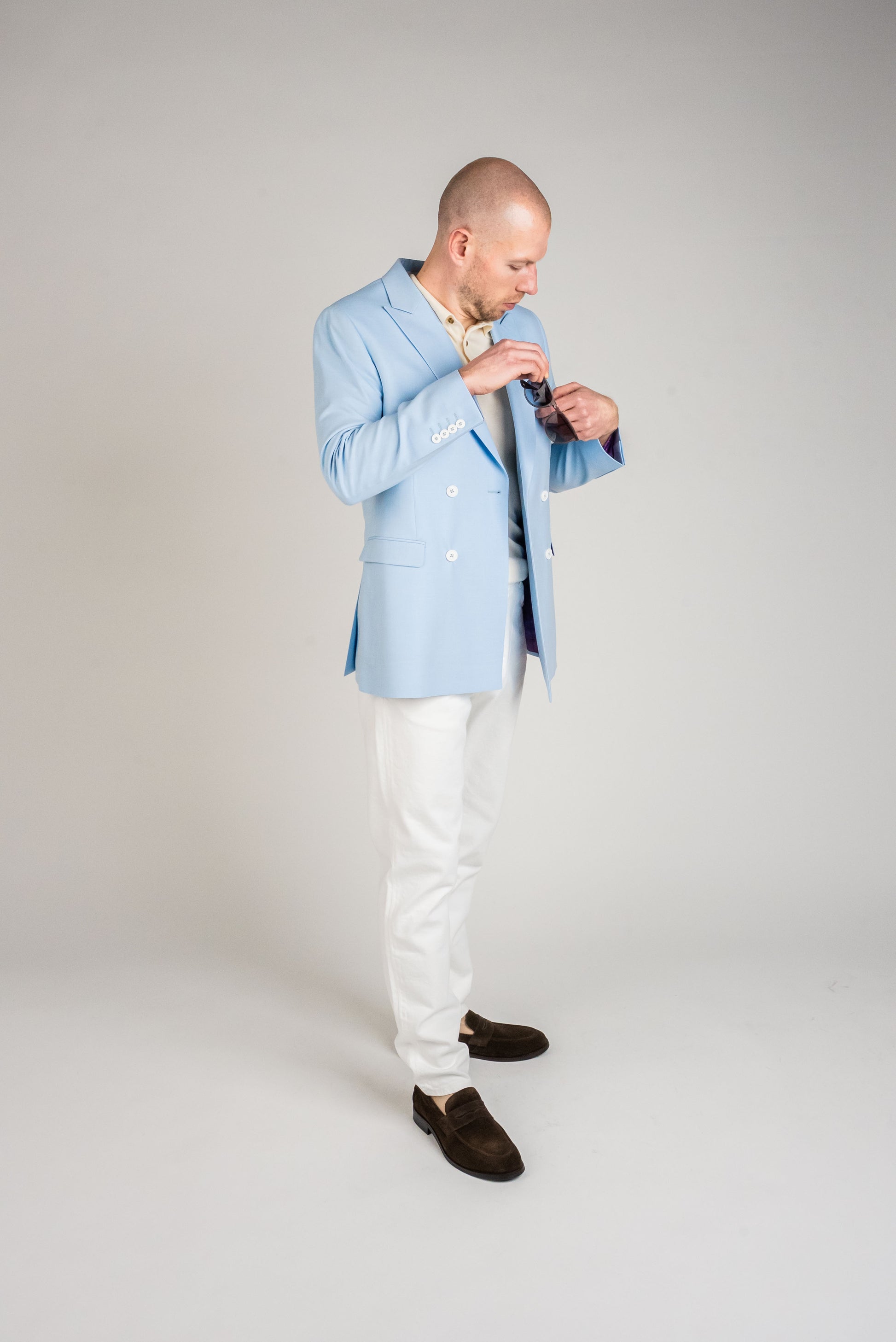 Den lyseblå farve giver et sofistikeret udtryk, samtidig med at den holder looket friskt og moderne. Kombinér sættet med en klassisk hvid skjorte for et skarpt og tidløst udtryk, eller tilføj et mønstret slips for at skabe et personligt twist. Ønsker du en mere afslappet stil, kan jakken bæres over en let striktrøje eller en enkel t-shirt.