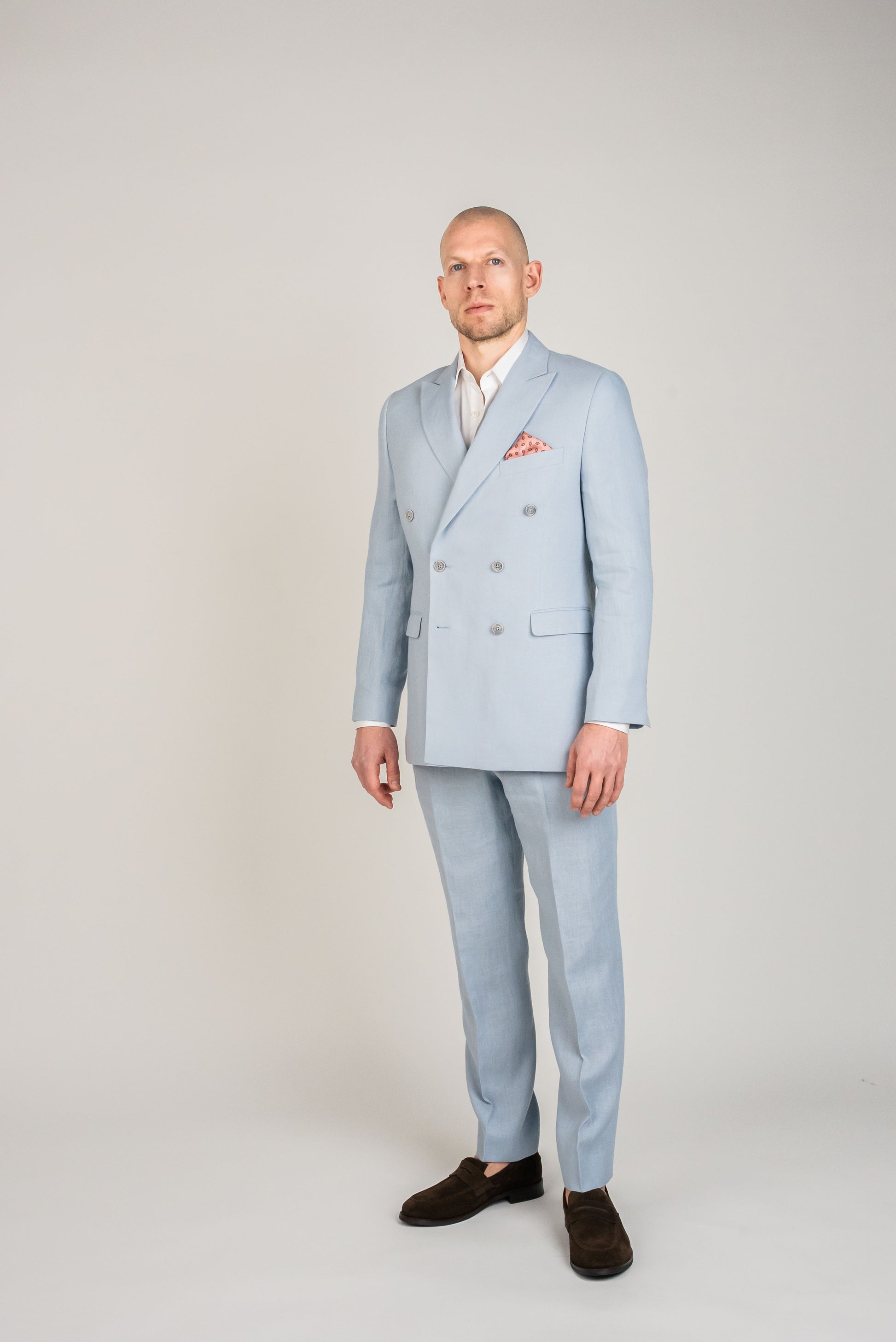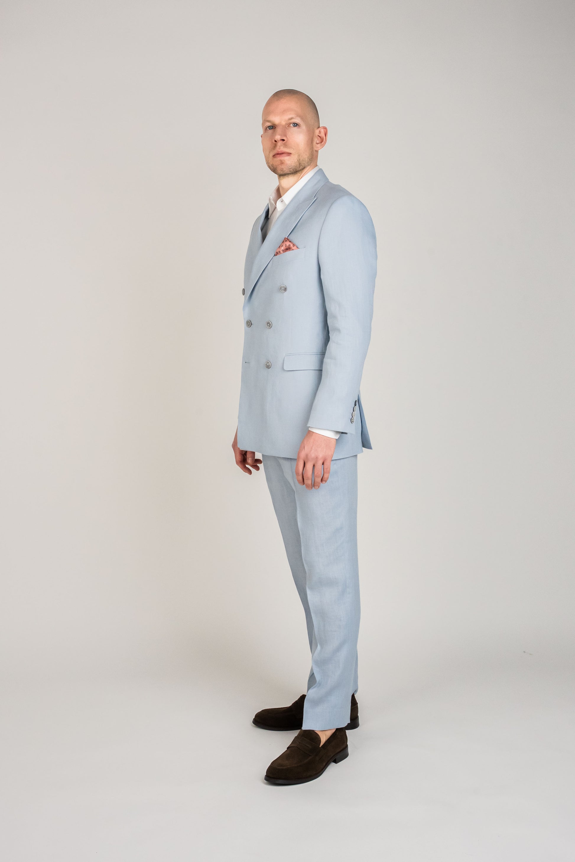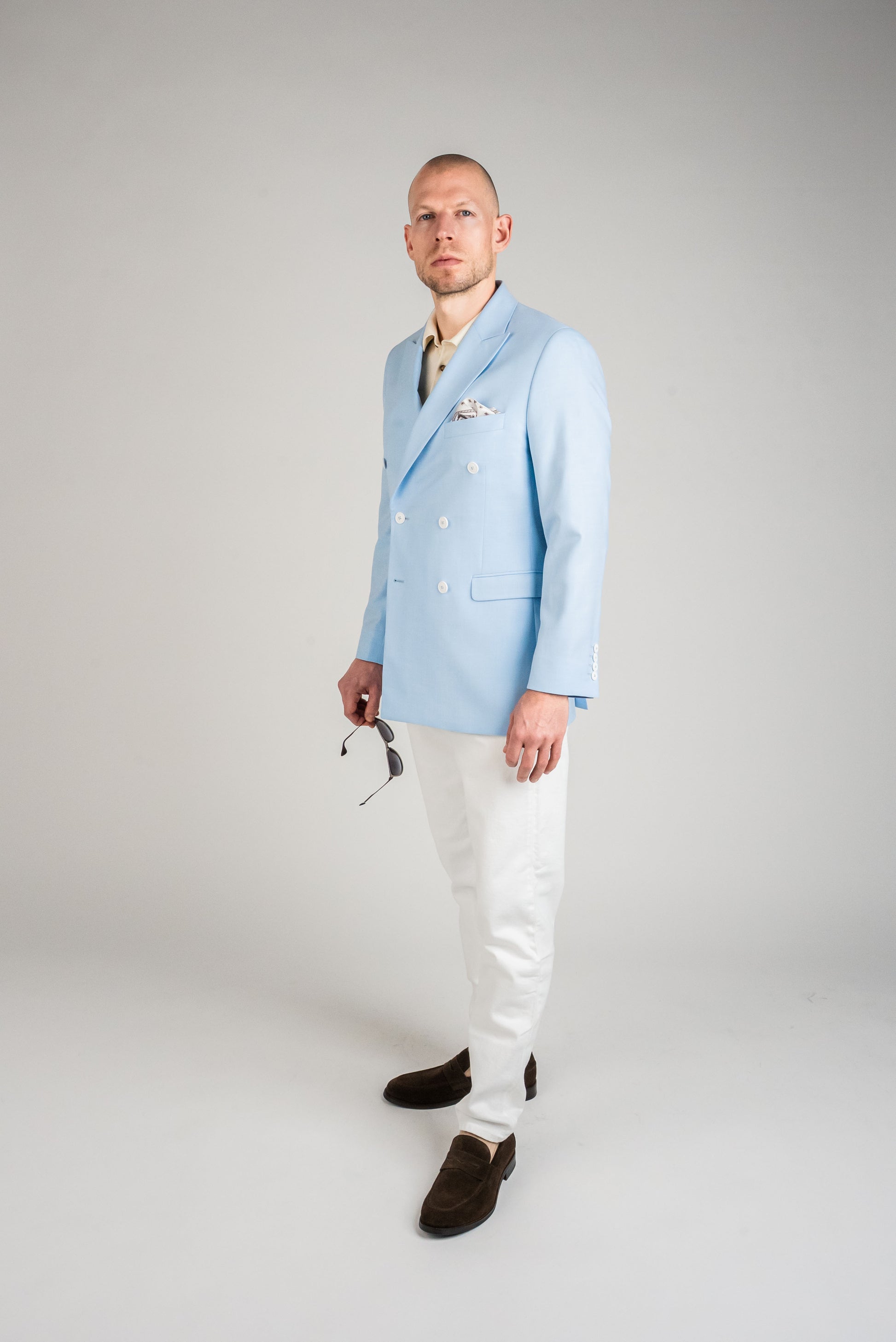 Den lyseblå farve giver et sofistikeret udtryk, samtidig med at den holder looket friskt og moderne. Kombinér sættet med en klassisk hvid skjorte for et skarpt og tidløst udtryk, eller tilføj et mønstret slips for at skabe et personligt twist. Ønsker du en mere afslappet stil, kan jakken bæres over en let striktrøje eller en enkel t-shirt.